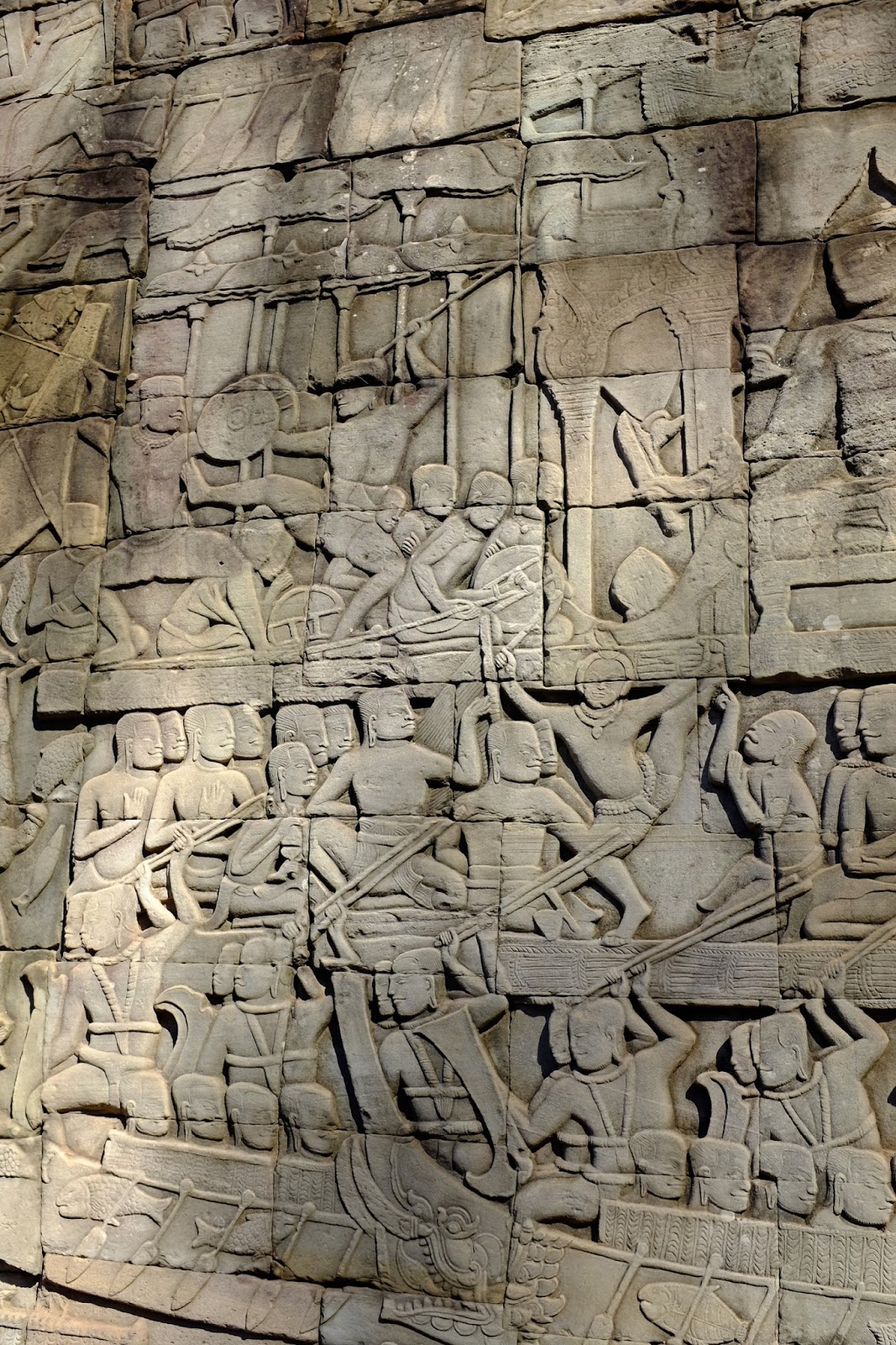 A cidade de Angkor Thom tem o formato quadrado, cercado de um canal de água onde em cada um dos quatro lados existe uma ponte. Todas as pontes são ricamente ornamentadas com a imagem dos soldados do Rei segurando uma cobra para defender o império, seguido de um enorme portal com a imagem do rosto do Rei Jayavarman.