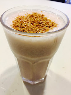 3) Smoothie de leite de amêndoa, morango, banana e sementes de linhaça para enfeitar (Podem usar as mil e uma combinações possíveis):