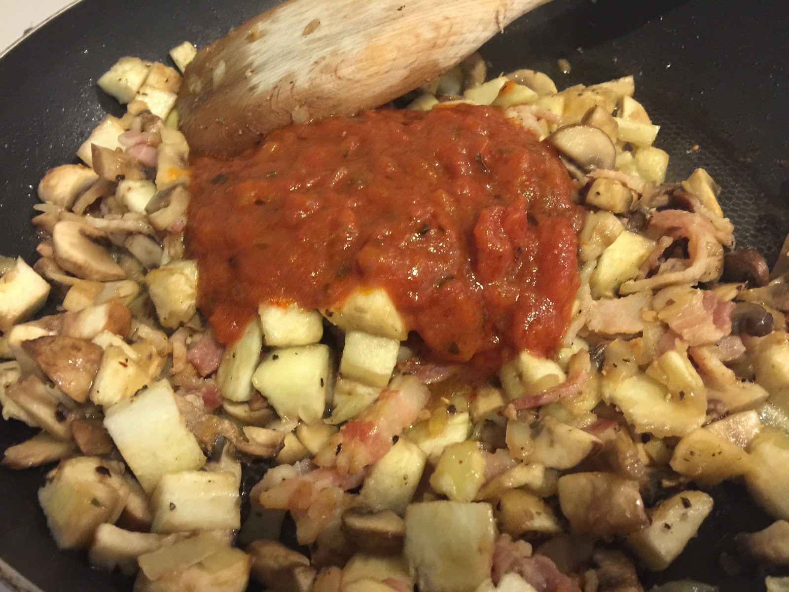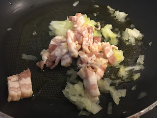 1. Numa frigideira anti-aderente, adicionar a cebola, o alho, azeite e o bacon e deixar alourar.