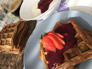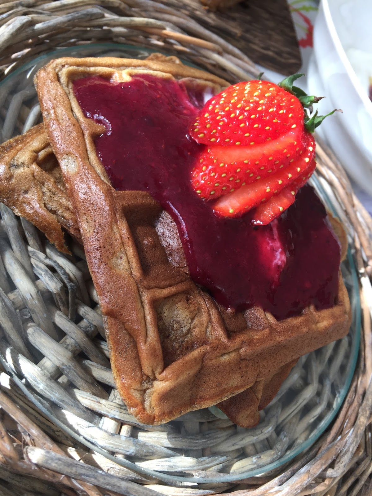 Estas wafles ficam mesmo fofas e como as bananas estavam muito maduras foi uma conjugação perfeita, mas achei que ainda podia torná-las mais deliciosas com um molho de frutos silvestres! E estava certa, difícil foi só comer uma, mas como são 'low carb' acaba por ser um 'pecado' matinal permitido, pois a seguir fomos pedalar 10 kms!