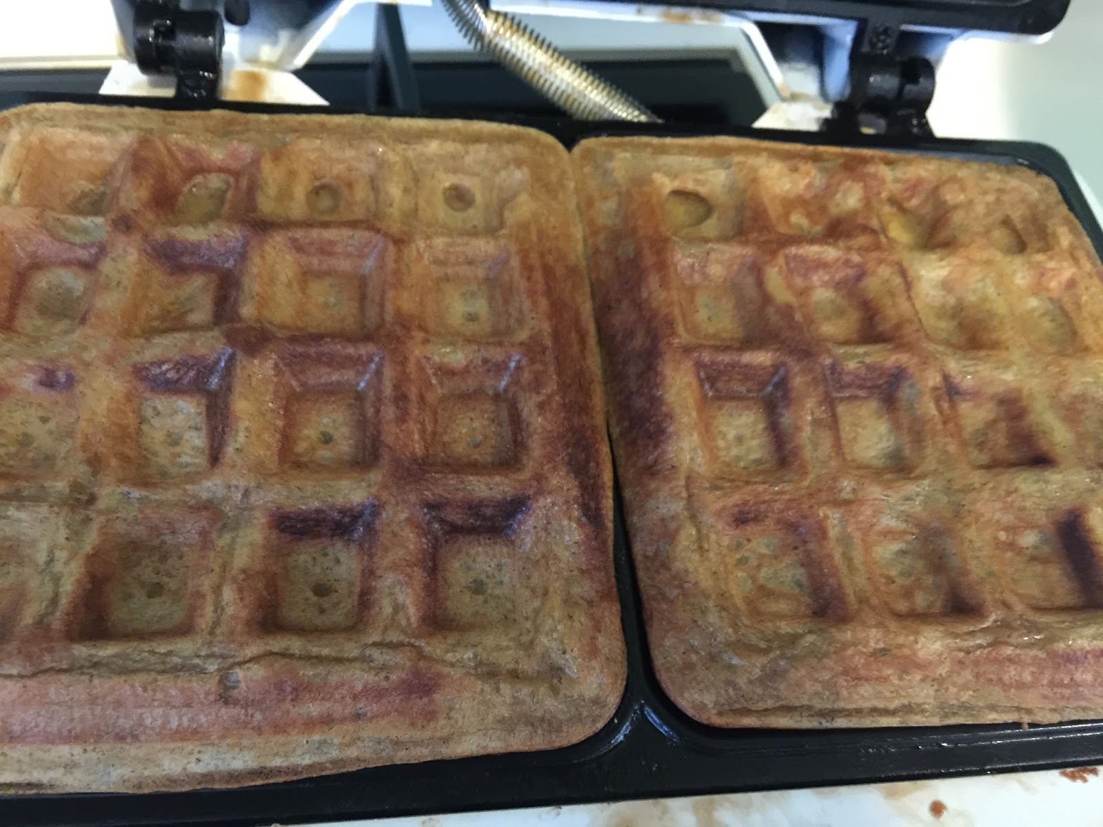 4. Pincelar a máquina de waffles com óleo de coco depois desta já estar quente e adicionar uma concha de massa a cada rectângulo, ficam muito altas e fofas,