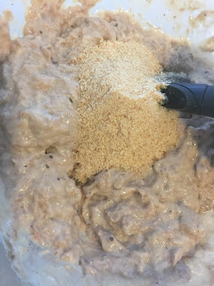 4. Adicionar o molho béchamel e as duas colheres de sopa de pão ralado à carne e arroz e